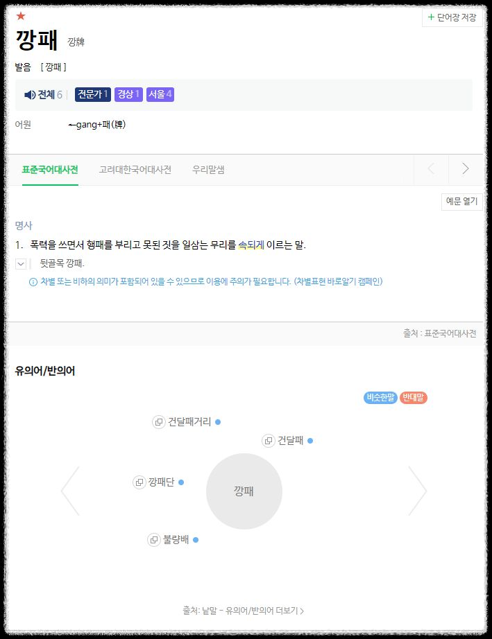 깡패의 유의어에는 건달패거리, 건달패, 깡패단, 불량배가 있다고 N사에서 제공하는 표준국어대사전에서 보여주고 있다.